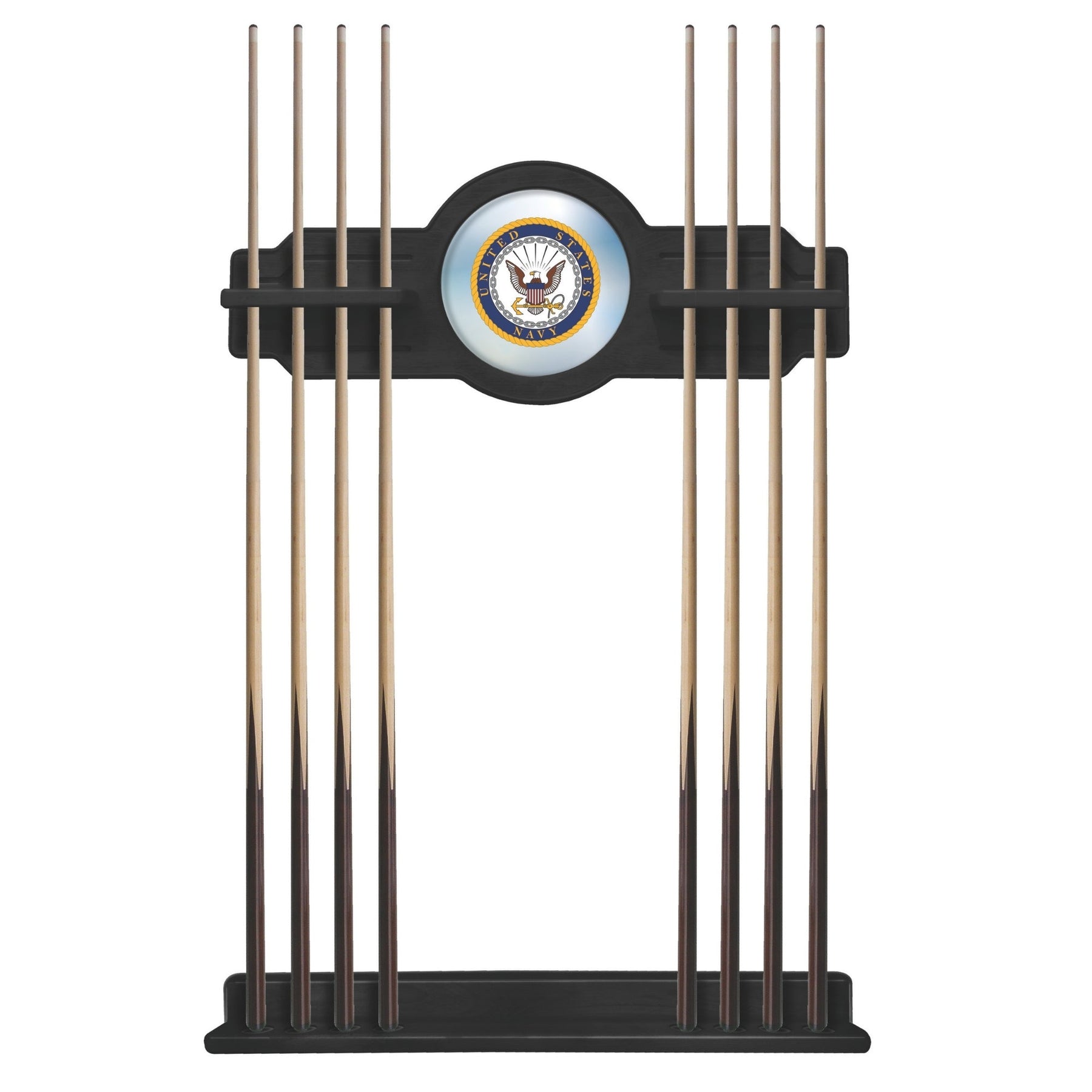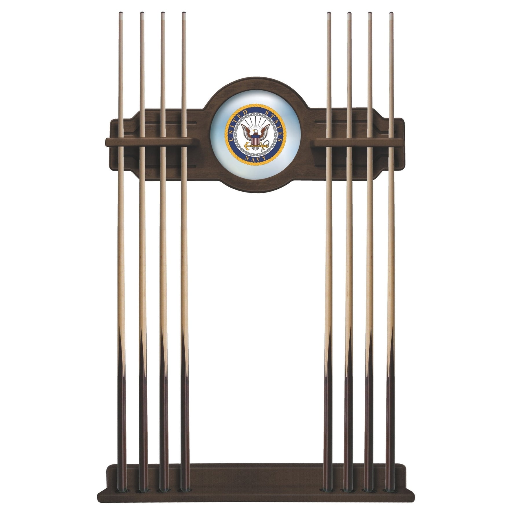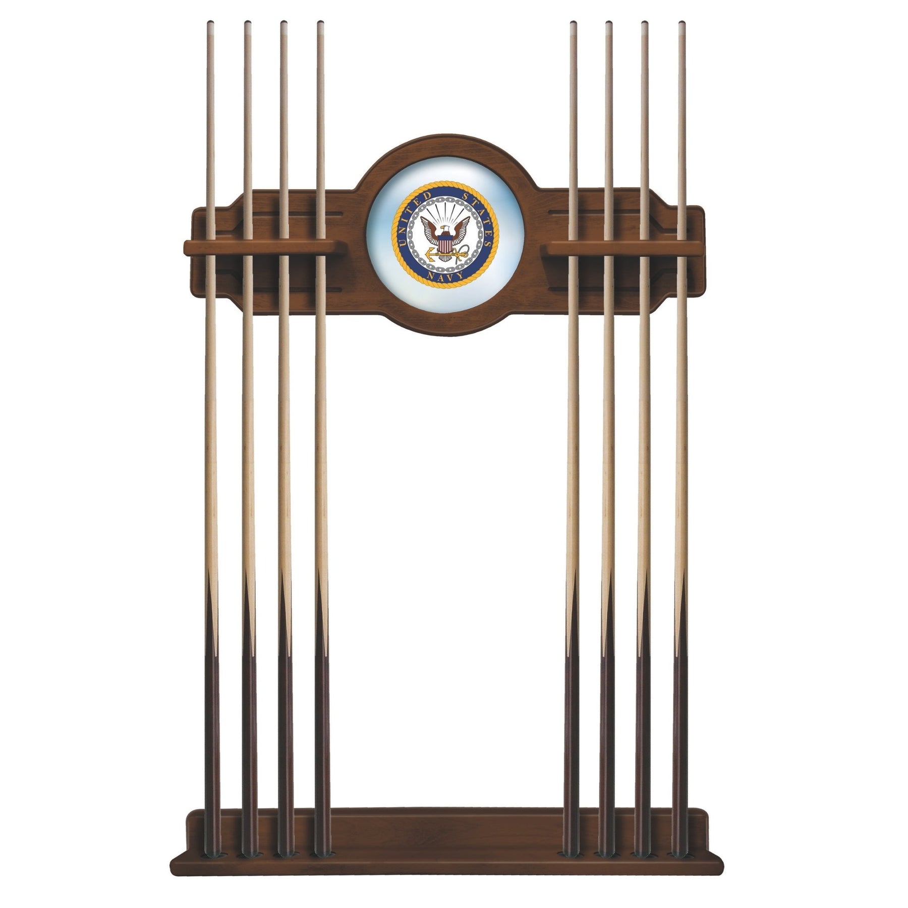 The Navy 2 piece Cue Rack is a must have accessory for your pool table and game room. The furniture quality que rack is solid wood, no particle board or veneer like the others in the market. The “shelves” have routed holes that hold the stick in place and won’t damage the cue shaft like inexpensive plastic clips. Finish off your game room with this beautiful Navy Eagle Solid Wood Cue Rack!