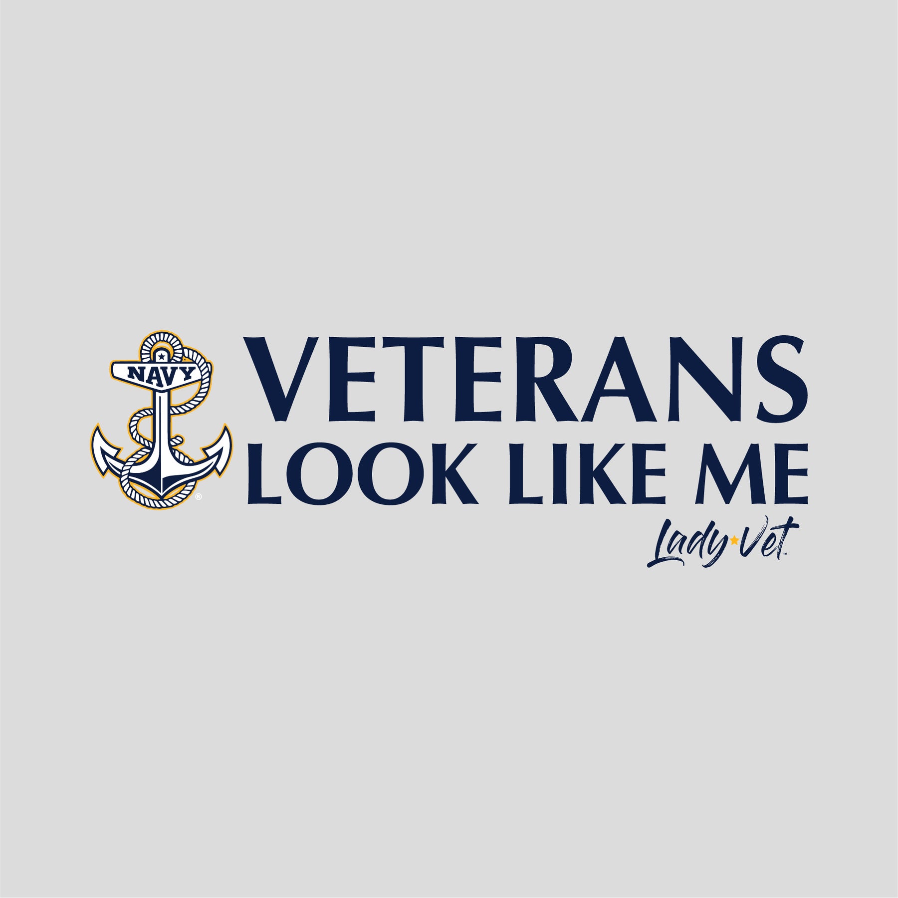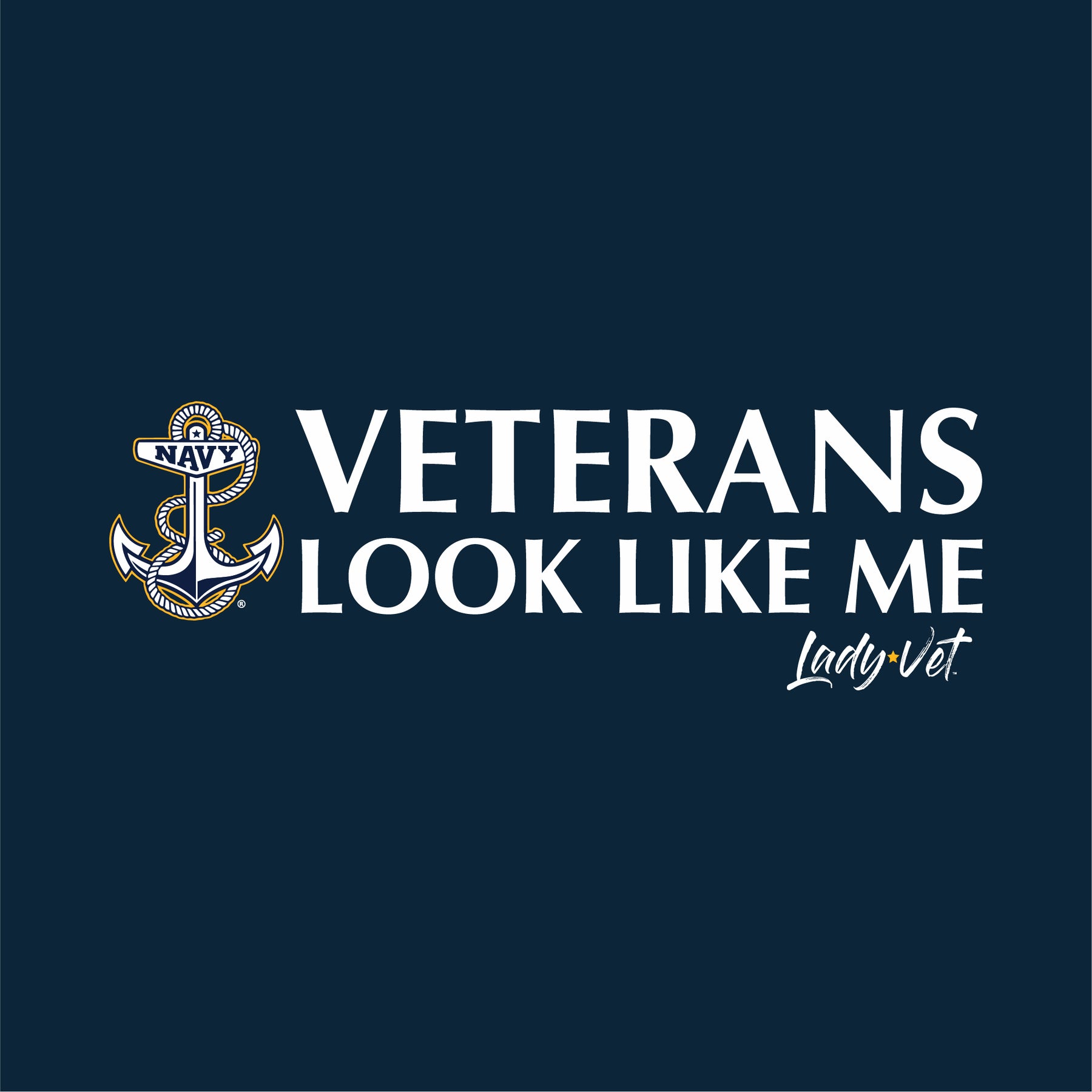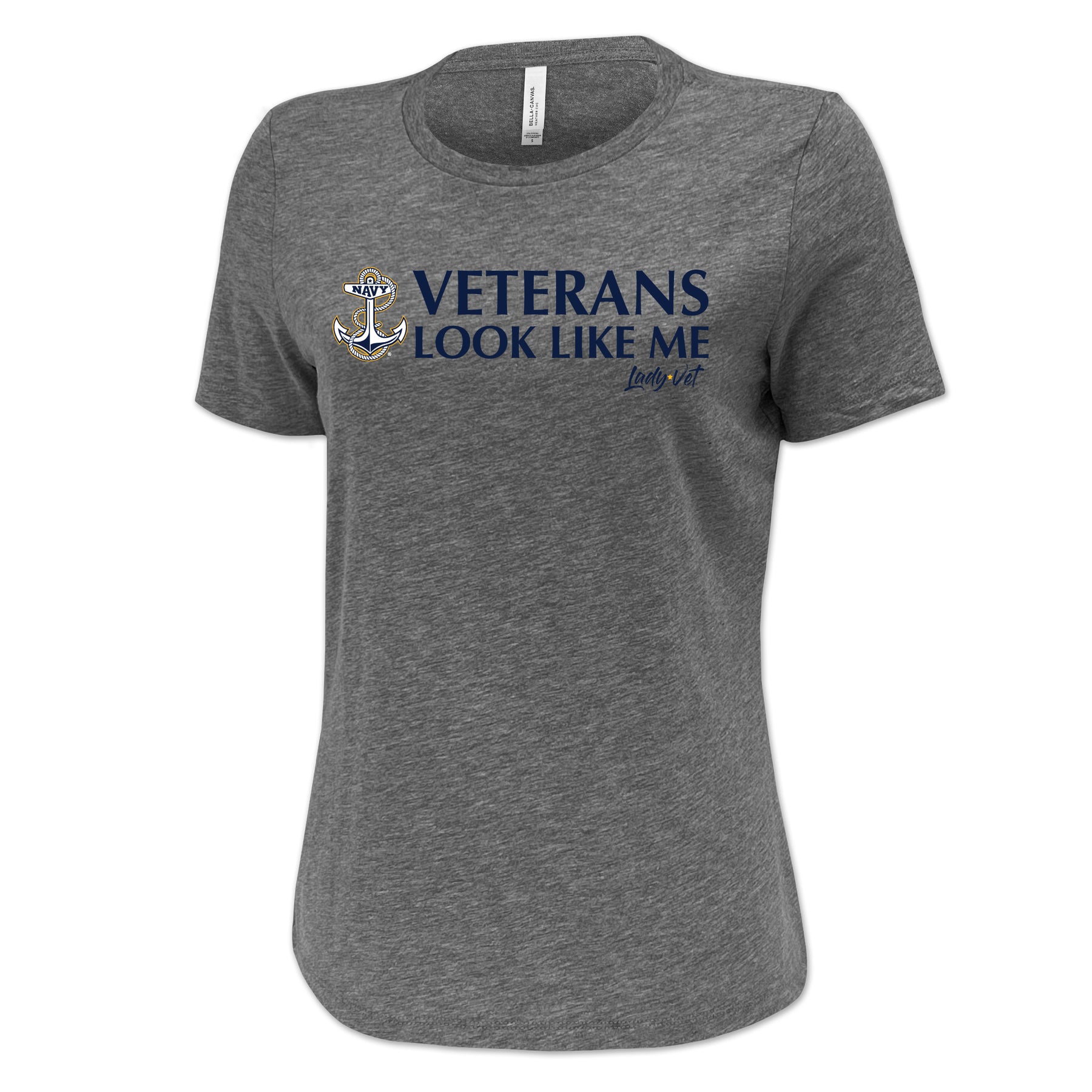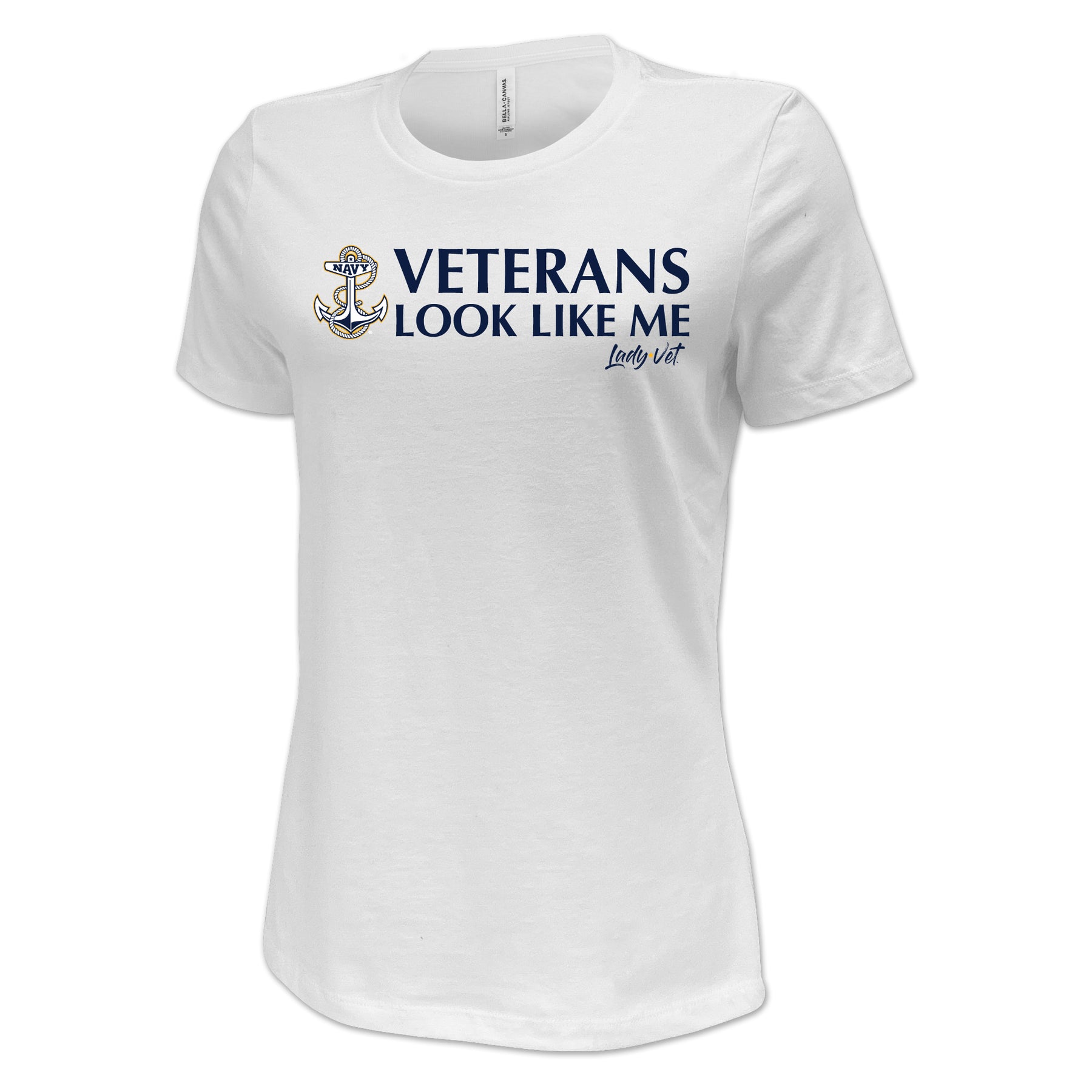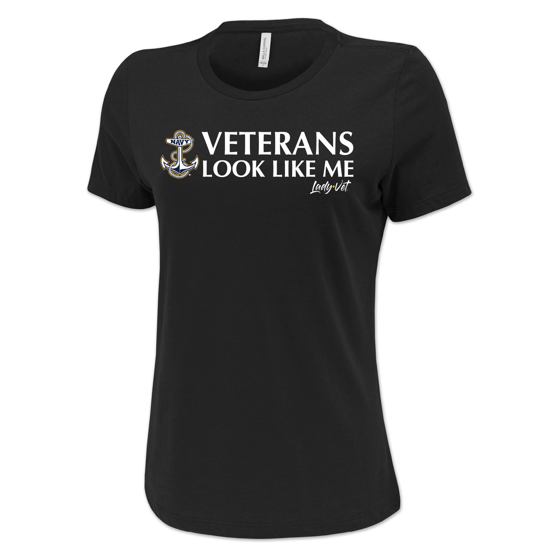 Lady Vet is a woman-owned, Veteran-owned brand created specifically to challenge public assumption of what a Veteran looks like. Show your support or wear it proudly; the Navy Vet Looks Like Me Ladies T-Shirt!