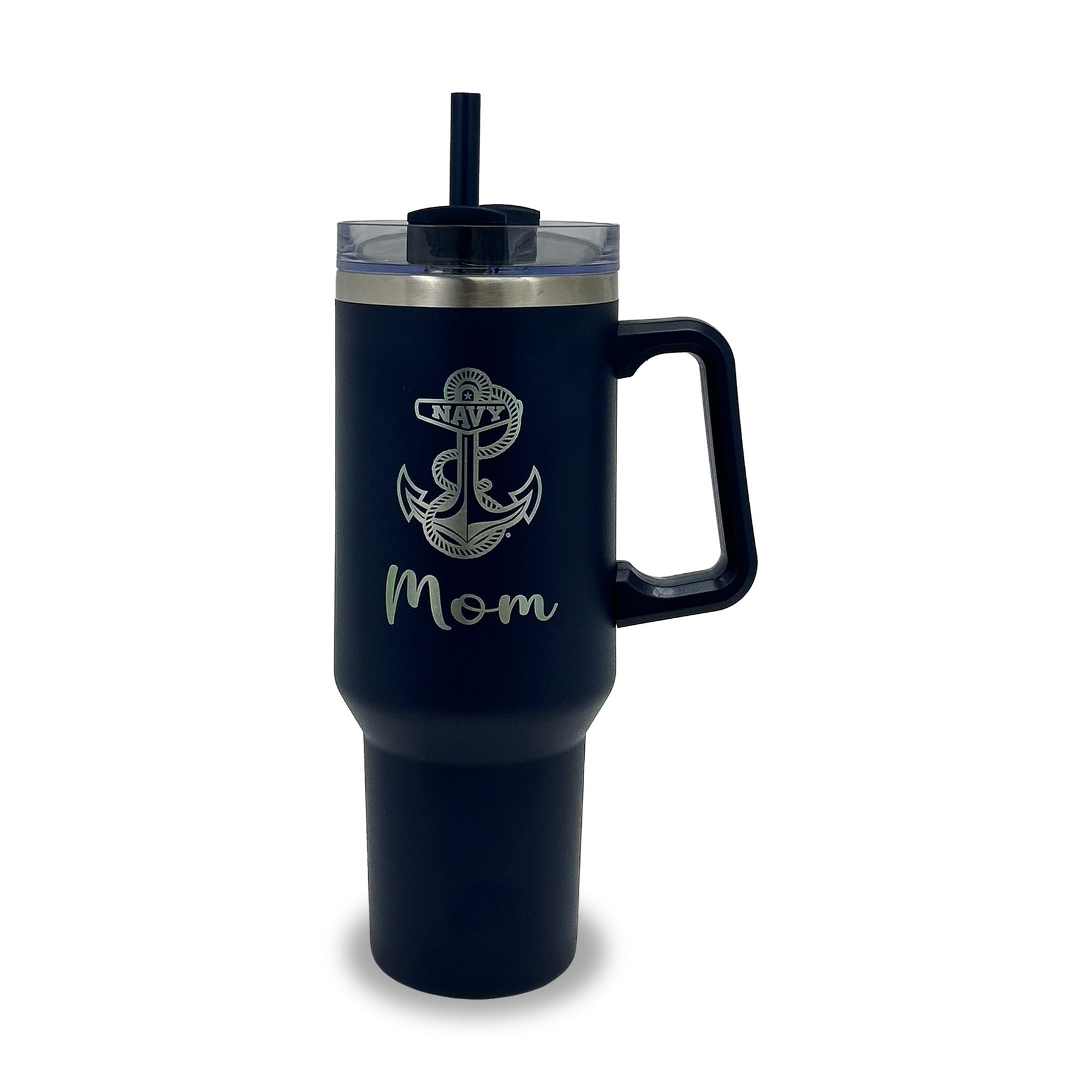 Show your pride wherever you go with this Navy Mom 40oz Stainless Steel Travel Mug—durable, double-walled, and ready to keep drinks hot or cold for hours. Featuring a laser etched design and convenient handle, it’s perfect for daily errands, road trips, and everything in between.