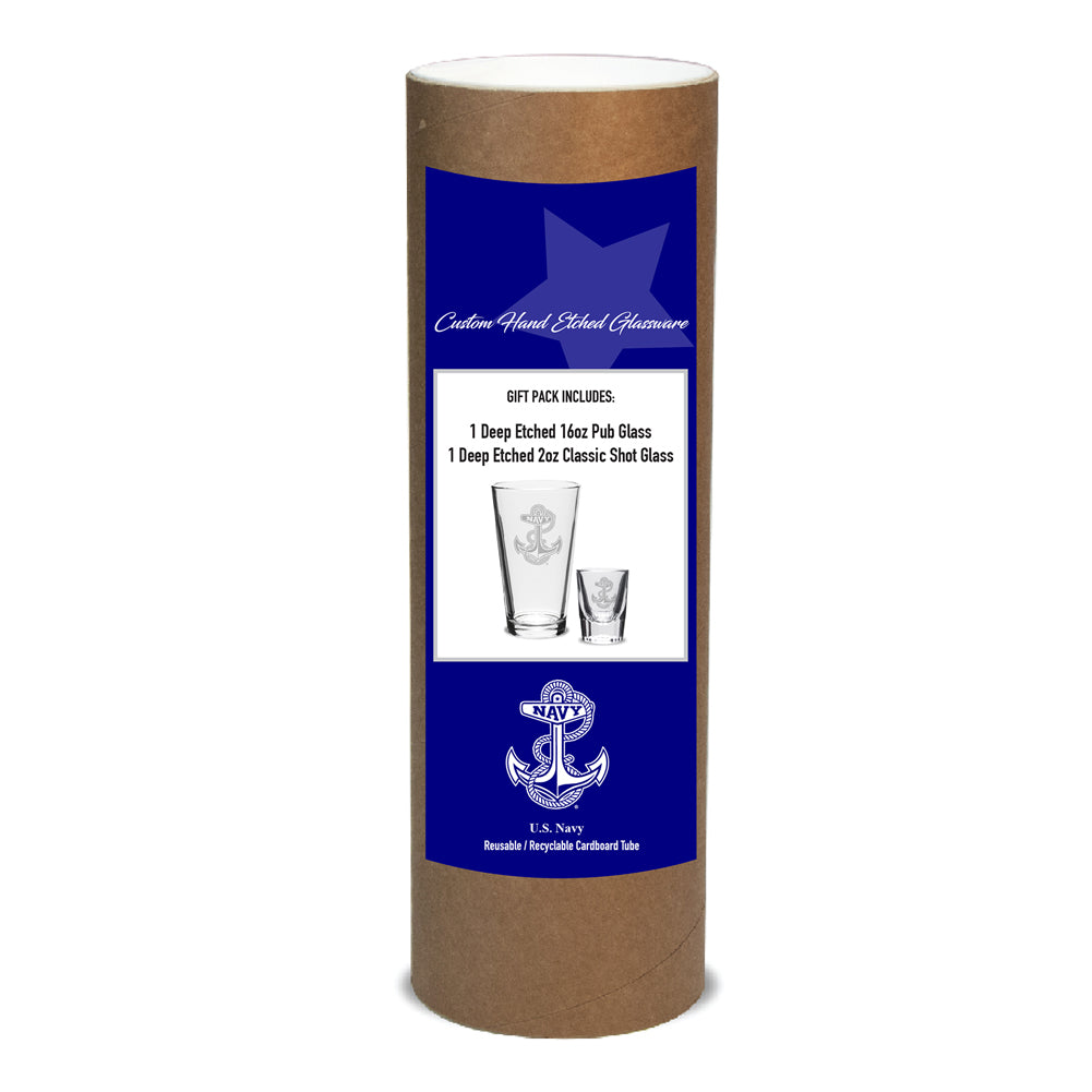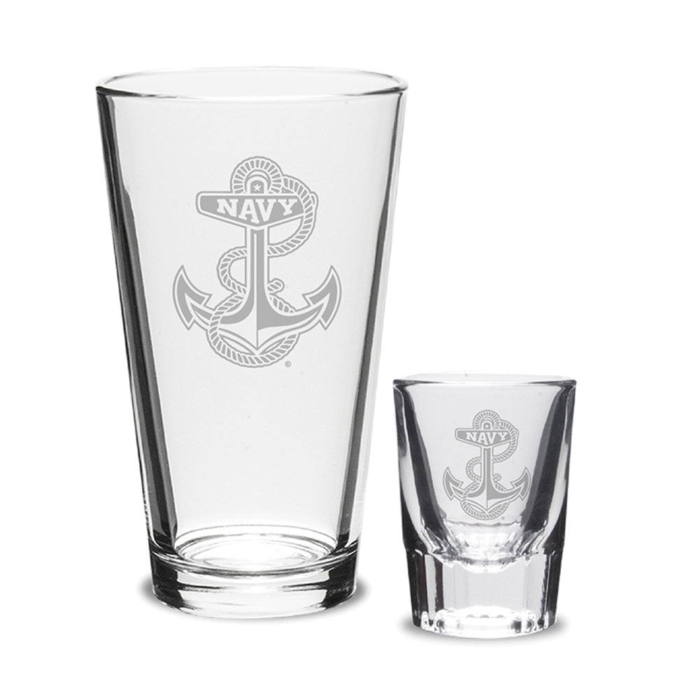 Step up your home entertaining game with the elegant Navy Anchor 16 oz Deep Etched Pub Glass and 2 oz Classic Shot Glass set. They also make a great gift!