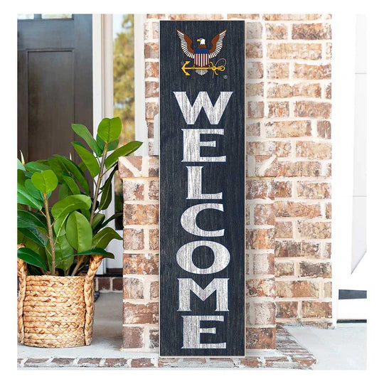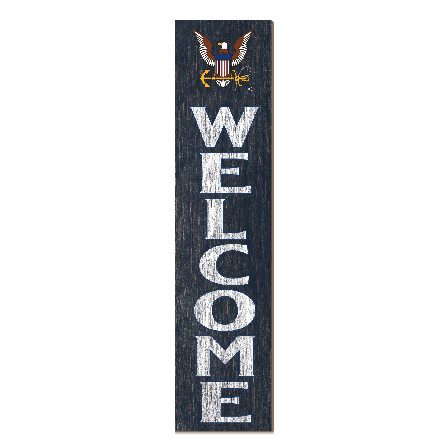 Display your Navy pride with this unique welcome sign! This sign is called a leaner because it is designed to sit and lean against an entryway or wall.