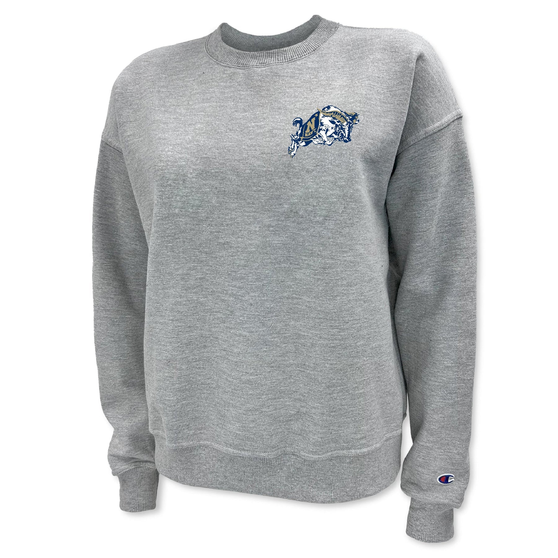 Show your Academy pride with the USNA Goat Ladies' Champion Powerblend Crewneck, featuring the iconic United States Naval Academy goat. This stylish and comfortable piece is perfect for showcasing your connection to the Academy and its storied traditions!