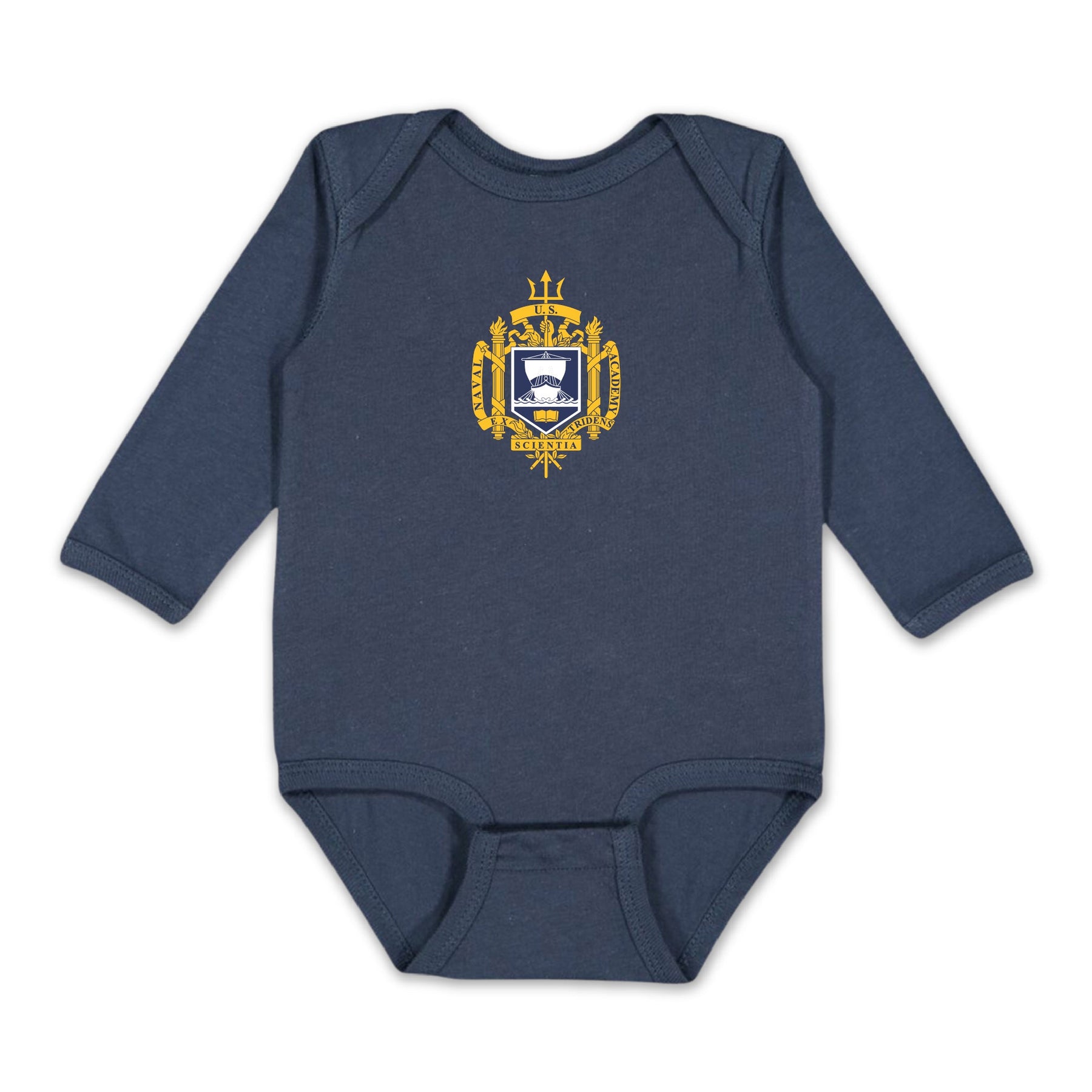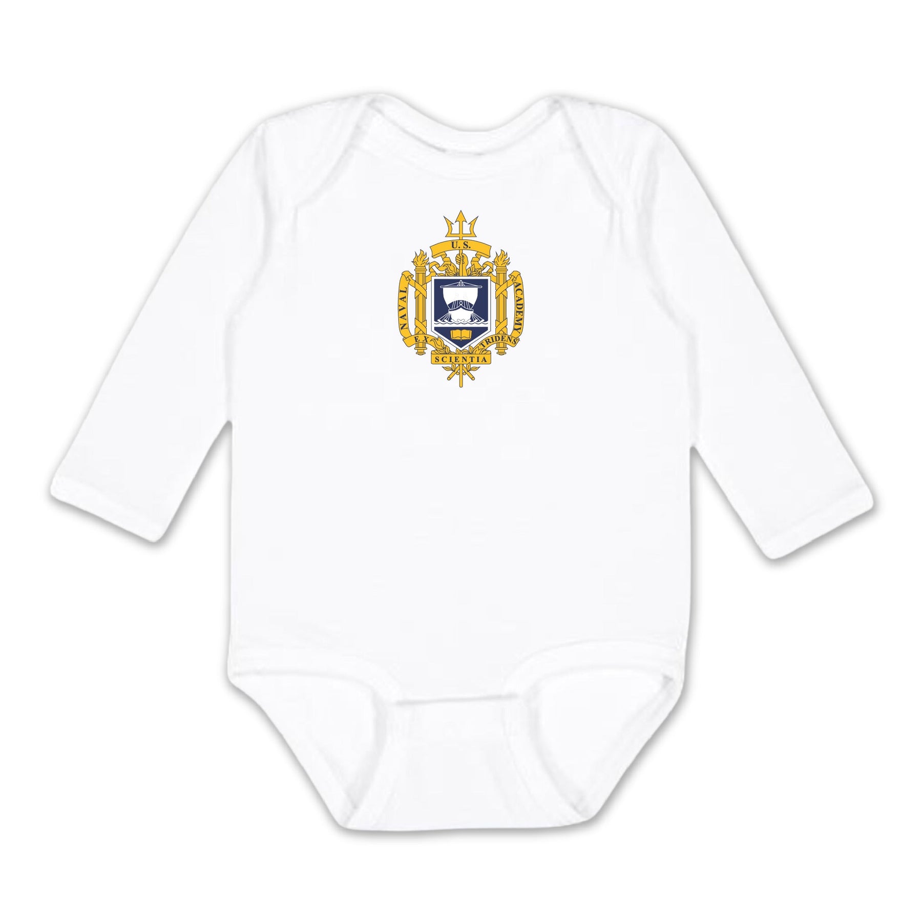 Start your little one's Naval Academy pride early with the USNA Crest Infant Long Sleeve Bodysuit! Perfect for your little tike to show off their family's pride for the US Naval Academy.