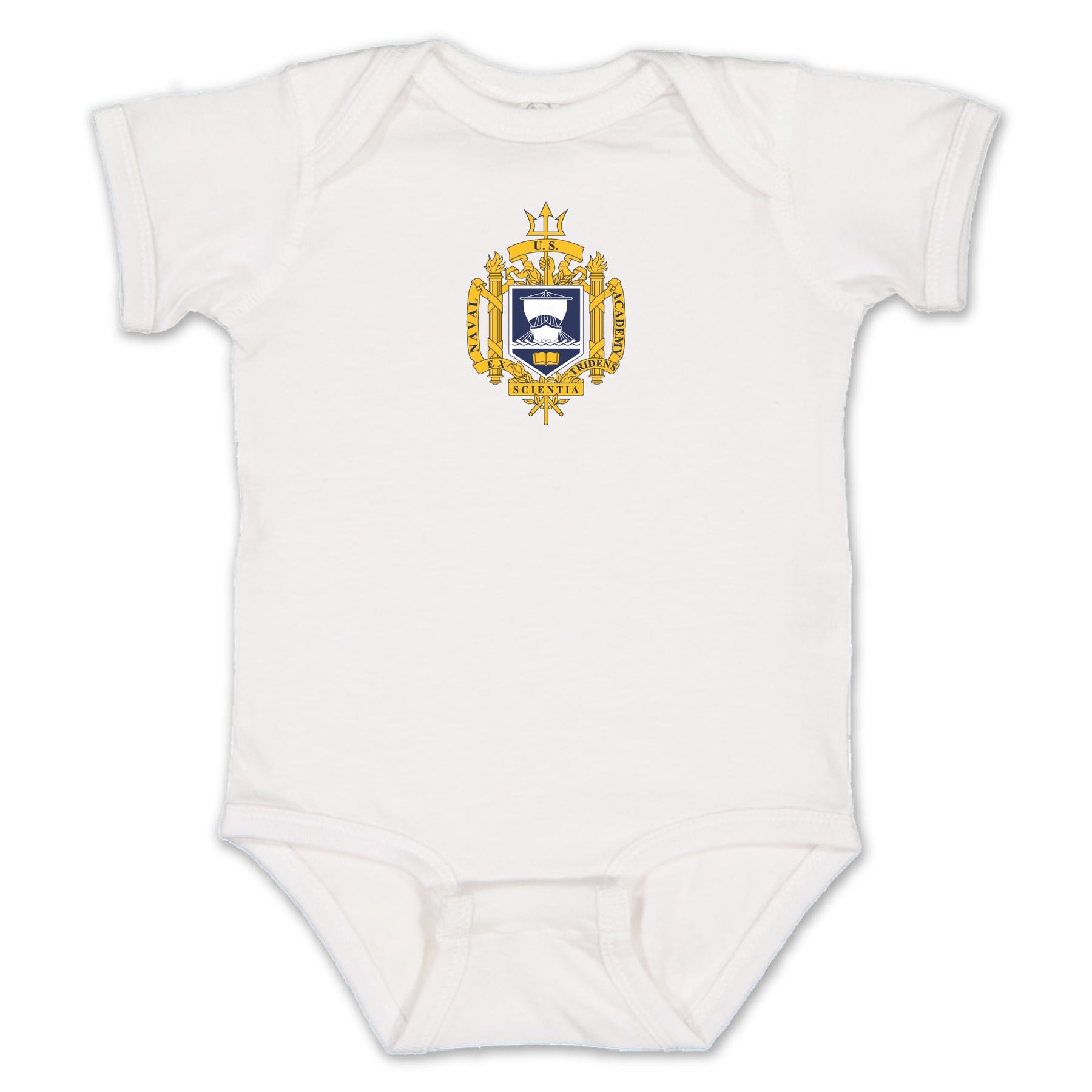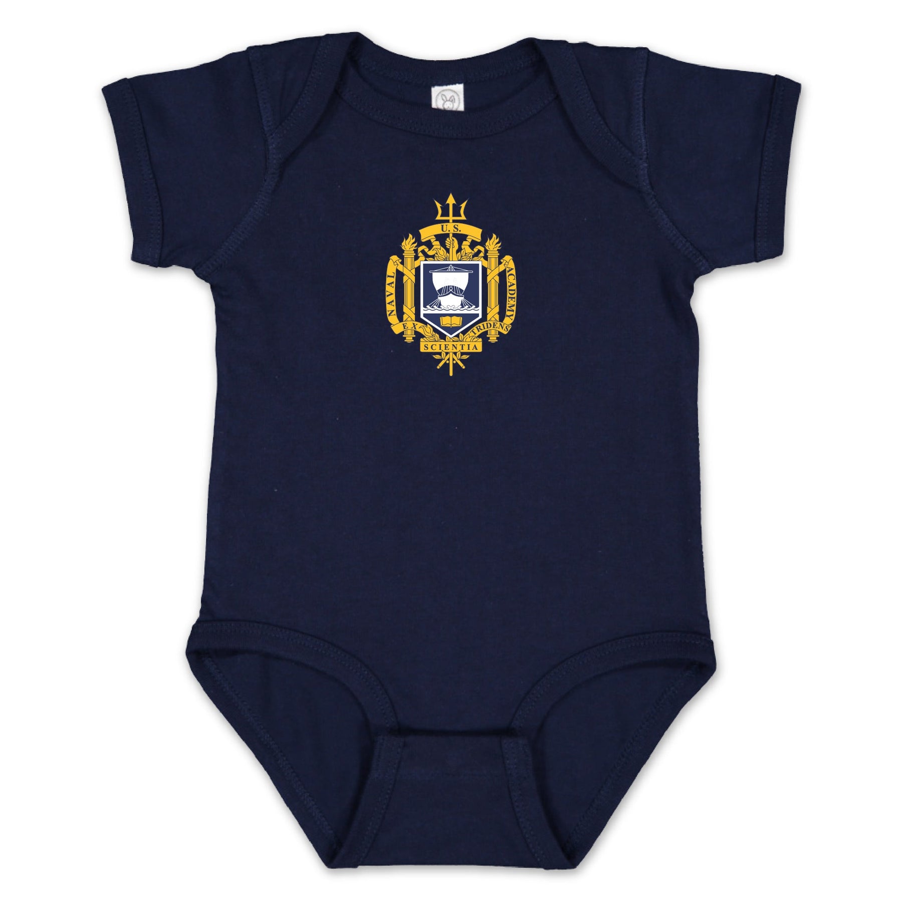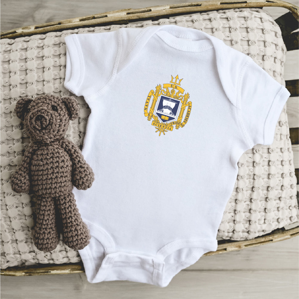 Start your little one's Naval Academy pride early with the USNA Crest Infant Romper! Perfect for your little tike to show off their family's pride for the US Naval Academy.