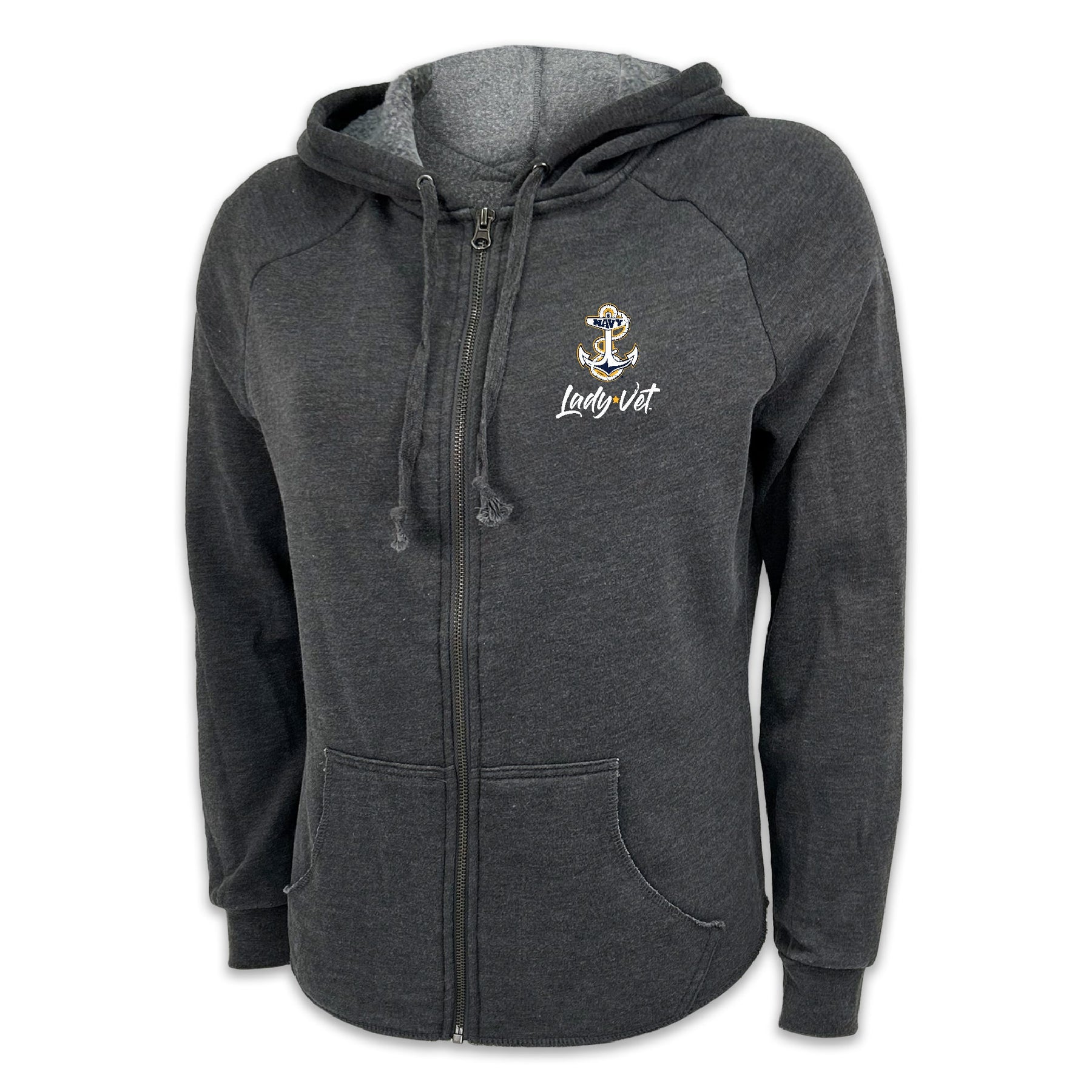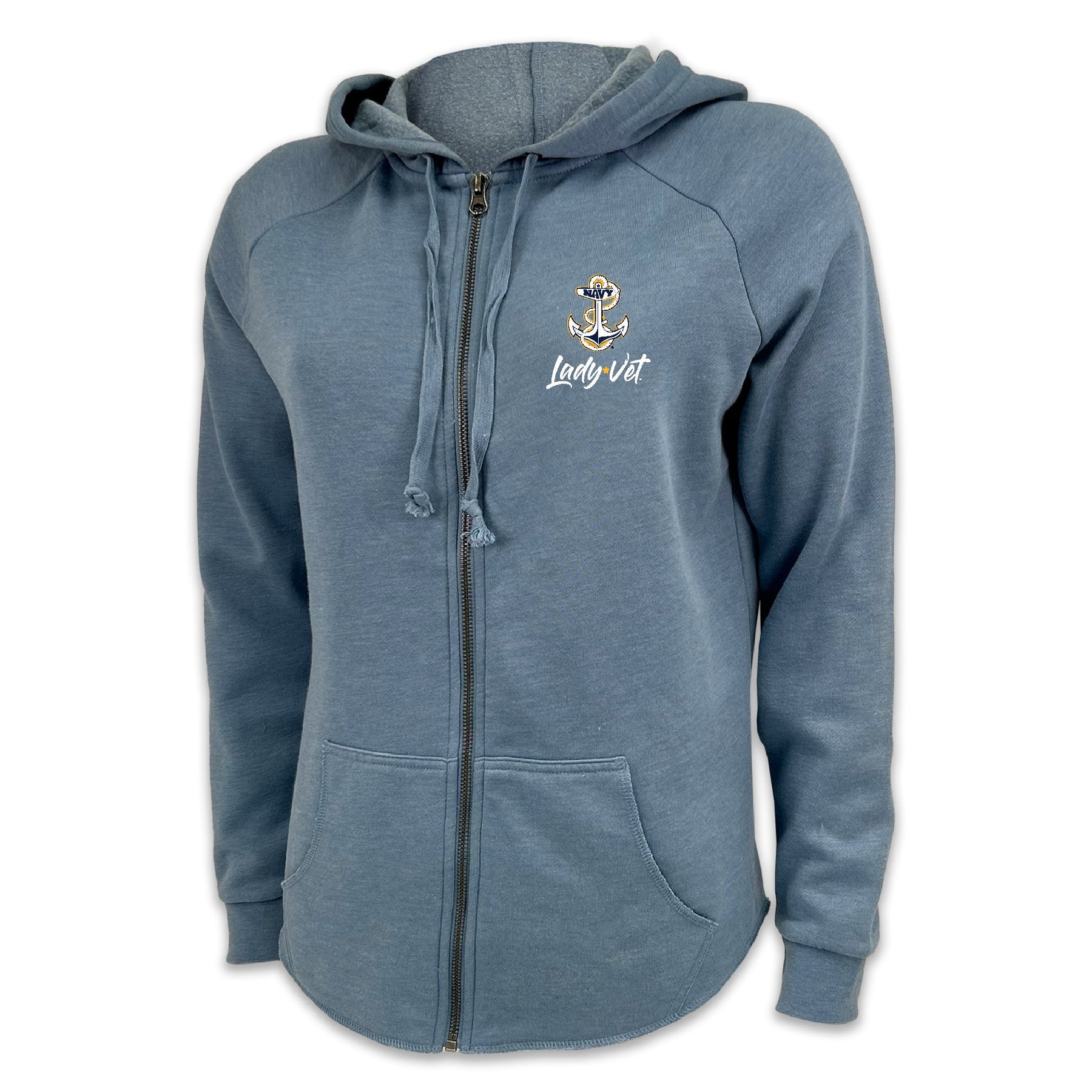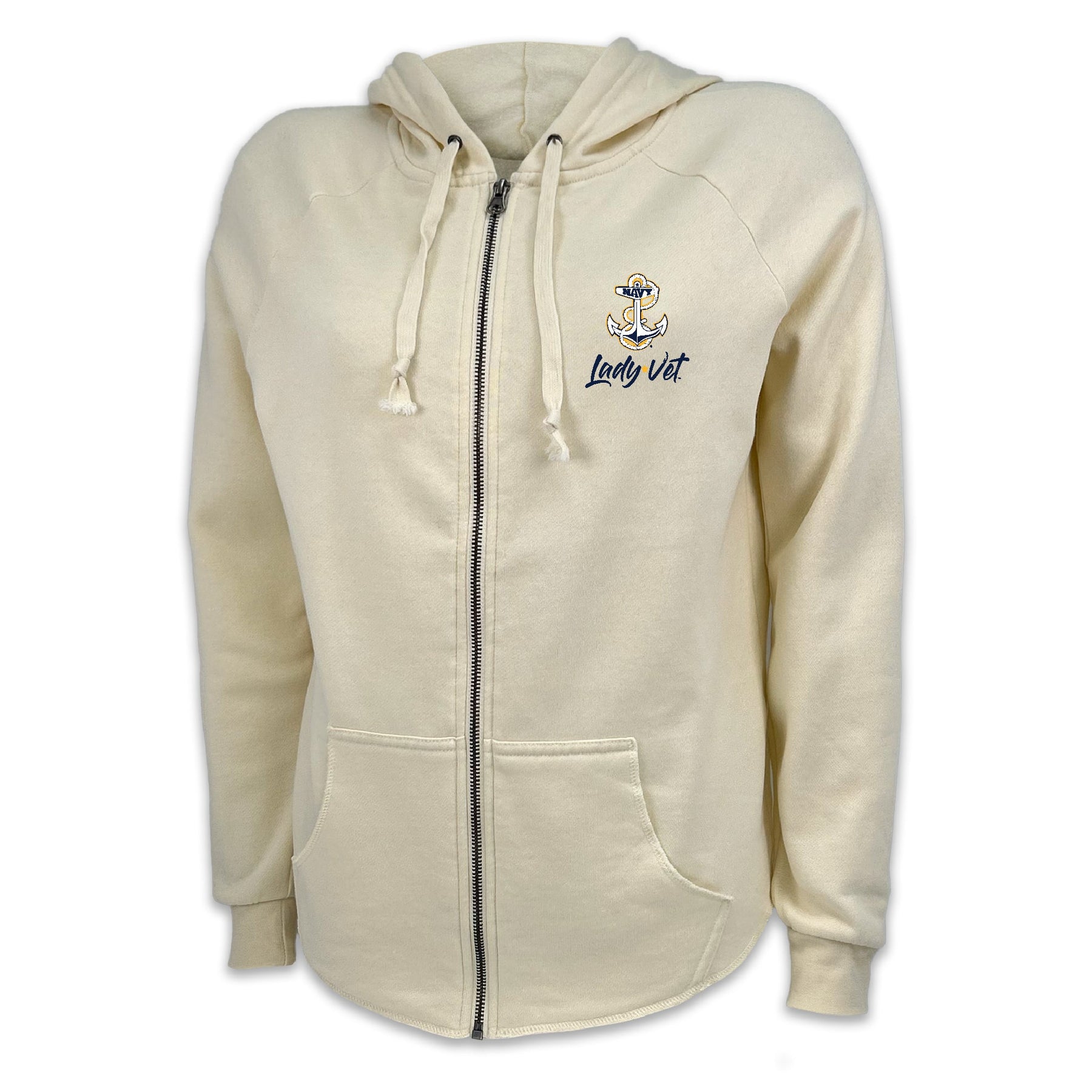 Stay warm and stylish with our Navy Lady Vet Ladies Full Zip Hood! Made from a soft cotton blend fleece, this classic-fit hoodie features raglan sleeves and an antique nickel zipper—perfect for showing your Navy pride in comfort.