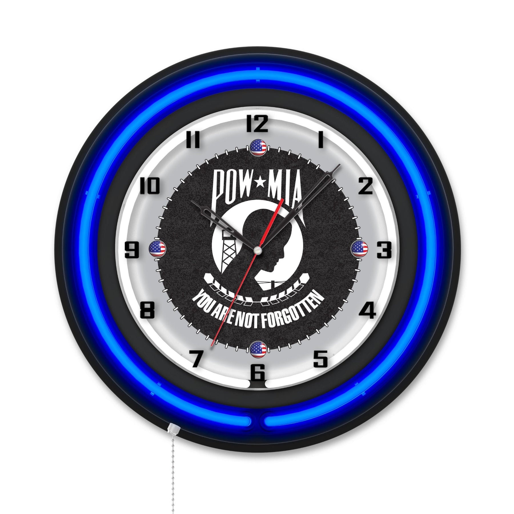 The POW/MIA Double Neon Wall Clock is the perfect way to show your support for our troops. Featuring a chrome casing and a color specific neon outer ring that accents the custom printed clock face which is lit up by an brilliant white, inner neon ring. The Neon rings are easily turned on and off with a pull chain on the bottom of the clock, and are powered by a UL Listed power transformer that runs off standard 120V outlet. Accurate quartz movement ensures proper time and is powered by a single, AA battery (not included). Add a bold and vibrant touch to your decor while proudly displaying your support for our troops!