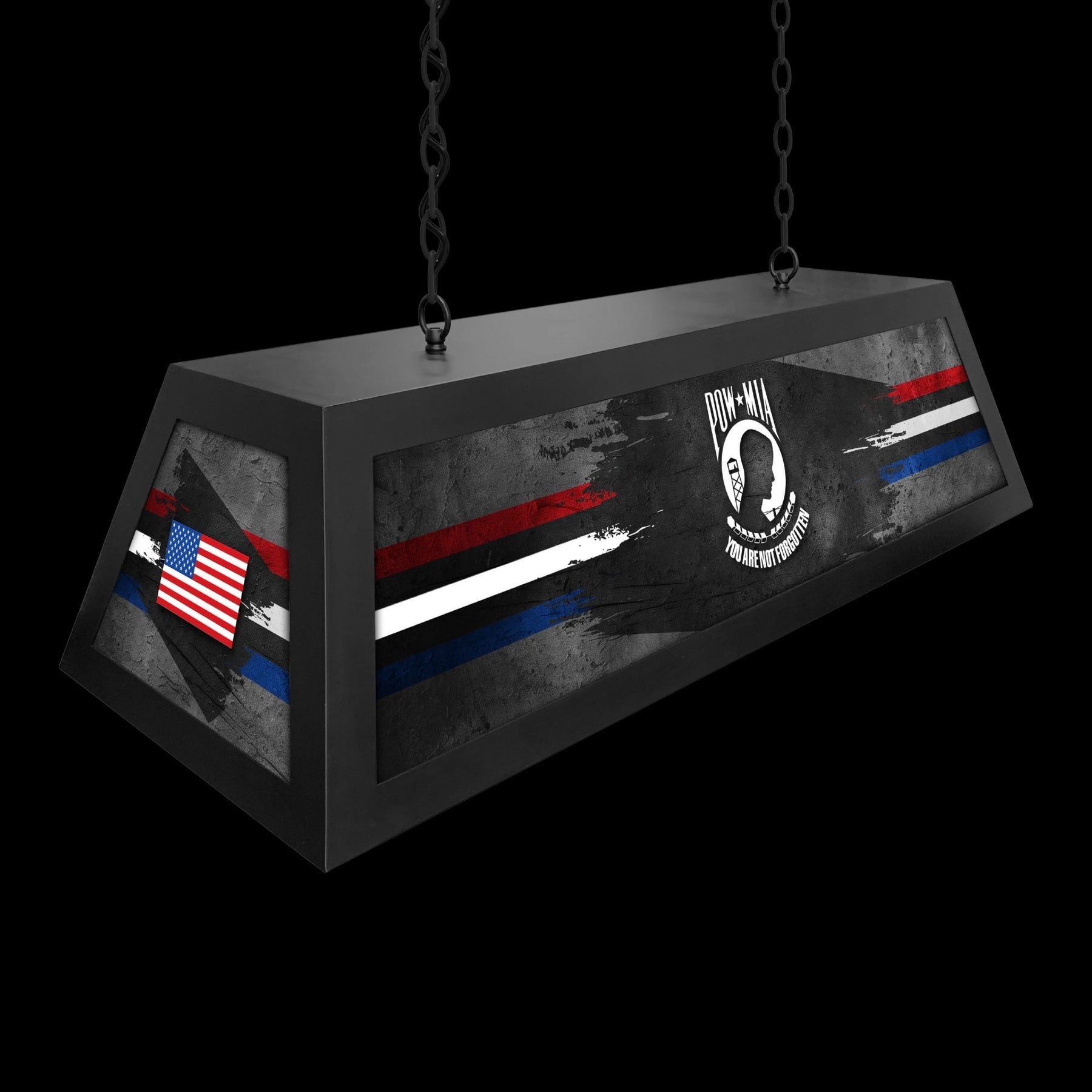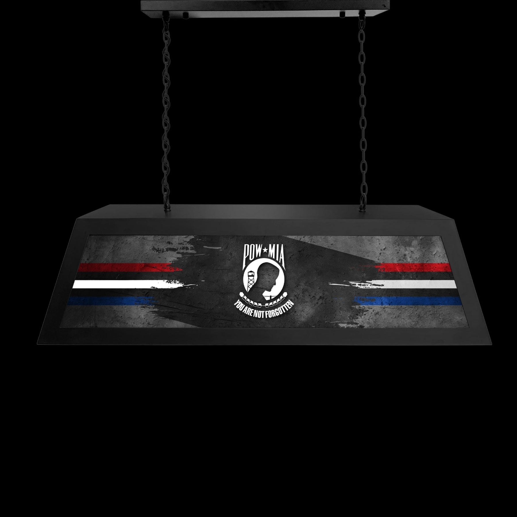 The POW MIA Box Long Light is a stylish and durable lighting fixture, designed to add a bold touch to your billiard tables, game rooms, or bars. Featuring a sleek metal frame with vibrant, backlit graphics, this light creates a dynamic ambiance. Whether used for a nostalgic reminder or to accent any living or work space, this light makes a great statement!