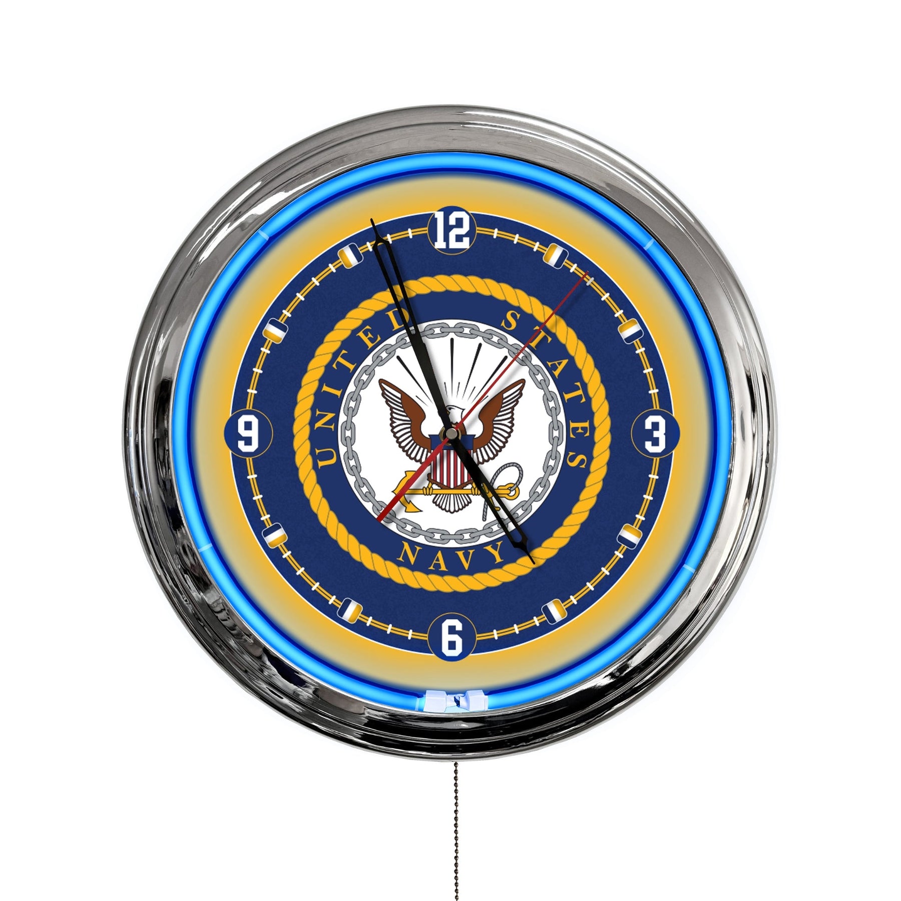 The United States Navy 16in LED Wall Clock is the perfect way to show your support for our troops. Featuring a chrome casing and a color specific neon outer ring that accents the custom printed clock face. The Neon rings are easily turned on and off with a pull chain on the bottom of the clock, and are powered by a UL Listed power transformer that runs off a standard outlet. Accurate quartz movement ensures proper time and is powered by a single, AA battery (not included). Add a bold and vibrant touch to your décor while proudly displaying your support for the United States Navy!